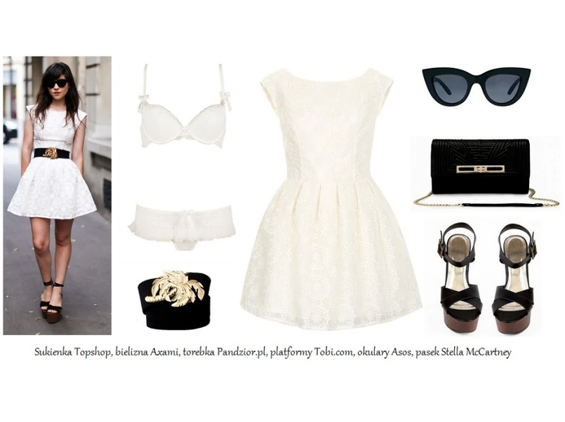 Biała sukienka to synonim letniej garderoby. Jak ją nosić? Betty Autier, autorka bloga leblogdebetty.com (główne zdjęcie), proponuje zestawić ją z cięższymi dodatkami w postaci grubego paska ze złotą palmą oraz sandałami na platformach. Dzięki temu ten nieco romantyczny look zyska pazura! Idealnym dopełnieniem tej stylizacji będą kocie okulary, elegancka torebka na łańcuszku oraz urocza bielizna marki Axami: elegancki stanik typu push-up, który podniesie biust i wyeksponuje piersi, a także delikatne stringi wykończone zmarszczonym tiulem, tworzącym finezyjną falbankę.