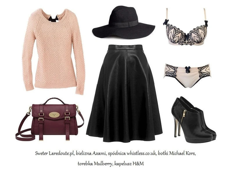 Ostatni zestaw skierowany jest do kobiet, które zamiast wysokich szpilek wolą stylowe półbuty! Te skąpane w czerni i złocie świetnie skomponują się ze skórzaną spódnicą zestawioną z bordową bluzą. Torebka na złotym łańcuszku doskonale zwieńczy ten look, a zmysłowa bielizna marki Axami sprawi, że nawet pomimo bluzy i braku obcasów poczujesz się w nim seksownie i kobieco jak nigdy dotąd!
