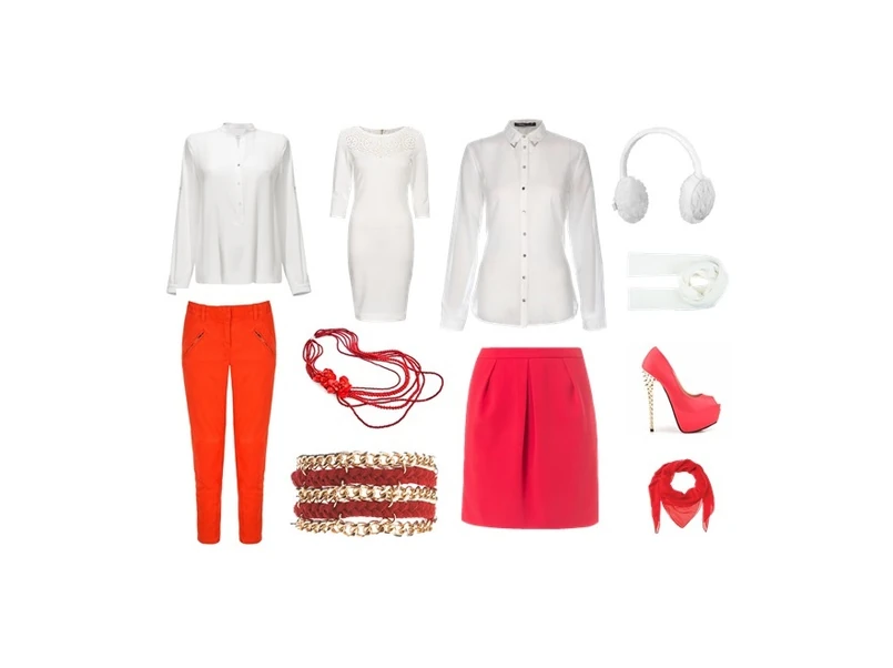 Czerwone spodnie i biały sweter to doskonała propozycja na wyjście z przyjaciółmi, natomiast czerwona sukienka w otoczeniu białych dodatków sprawdzi się wieczorem.