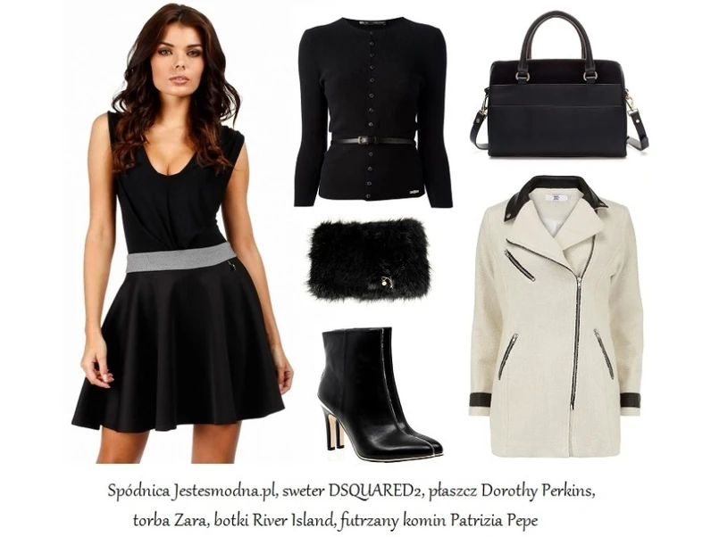 Bazą naszych stylizacji jest rozkloszowana spódniczka ze sklepu Jestesmodna.pl, uszyta z gładkiej tkaniny i charakteryzująca się pasem wykonanym z kontrastowego materiału z wzorem pepito. Spódniczka ta dostępna jest w trzech kolorach: czarnym, czerwonym i granatowym. Czarna będzie świetnie wyglądać w duecie z klasycznym kardiganem (główne zdjęcie). Zestaw ten, uzupełniony pojemną torbą, botkami na niewielkim obcasie, futrzanym kołnierzem oraz skąpanym w bieli płaszczu typu biker, da nam modną i stylową propozycję do pracy.