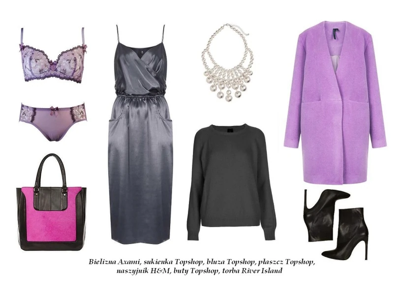 Satynowa, szara, pięknie połyskująca sukienka idealnie podkreśli kobiecą figurę, eksponując talię oraz delikatnie opływając biodra (główne zdjęcie). Zestawienie jej z czarną bluzą nie tylko nada stylizacji nowoczesności, ale też bardzo ją odmłodzi. Lawendowy, oversize'owy płaszcz o pudełkowym kroju to kolejny, bardzo modny element tego looku. Męski w fasonie - jest prawdziwym must have w szafie fashionistek. Jako, że podstawą każdego ubioru powinna być dobrze dobrana bielizna, postawmy na taką wysokiej jakości, która prawidłowo podtrzyma i wyeksponuje biust. Marka Axami proponuje nam misternie zdobiony lawendowy komplet. Biustonosz podkreśli biust i sprawi, że przy kopertowym dekolcie sukienki będzie się on prezentował bardzo seksownie. Eleganckie figi zapewnią wygodę. Stylizację dopełnią dodatki: ciekawy naszyjnik ożywi dekolt, czarne botki nadadzą smukłości sylwetce, a modna, duża torebka pomieści wszystkie niezbędne przedmioty.