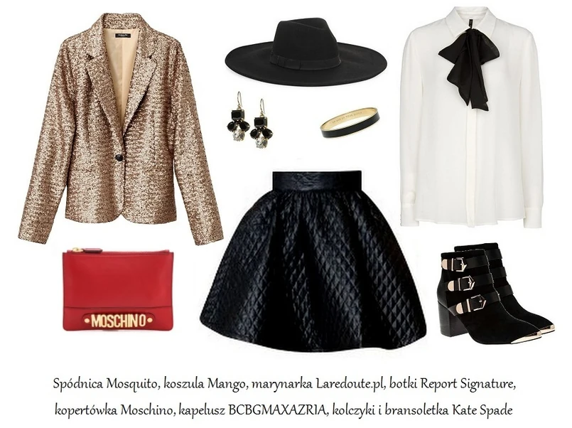 Rozkloszowana spódnica marki Mosquito podkreśli talię i będzie świetnie wyglądać w połączeniu z białą, gładką koszulą ozdobioną czarną kokardą (główne zdjęcie). Złota, cekinowa marynarka doda blasku, botki ze złotymi klamrami oraz złotą aplikacją na nosku przykują uwagę, a kontrastująca z całym zestawem czerwona kopertówka pomieści wszystkie kobiece skarby. Ciekawym uzupełnieniem tej stylizacji będzie kapelusz z szerokim rondem. Oto modny i stylowy look w sam raz na świąteczną kolację!