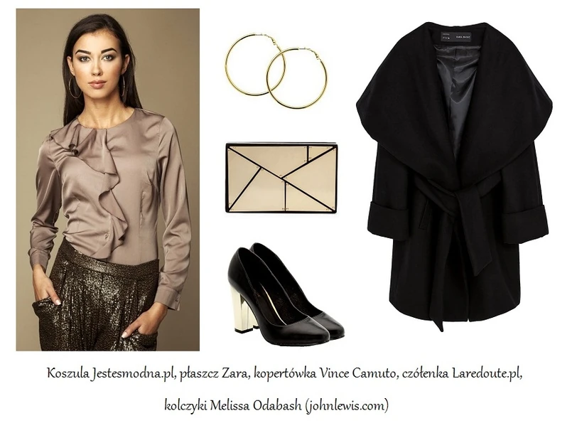 Duet czerni i złota (główne zdjęcie) to coś, co zawsze robi wrażenie, a ponadto doskonale wkomponowuje się w świąteczny klimat. Ozdobiona charakterystyczną falbaną połyskująca koszula ze sklepu Jestesmodna.pl stworzy zgrany duet z metalicznymi spodniami. Czarny płaszcz z ogromnym szalowym kołnierzem doda szyku, a czółenka na złotym obcasie przykują uwagę. Ciekawym uzupełnieniem tej stylizacji będą oryginalna kopertówka oraz kolczyki koła.