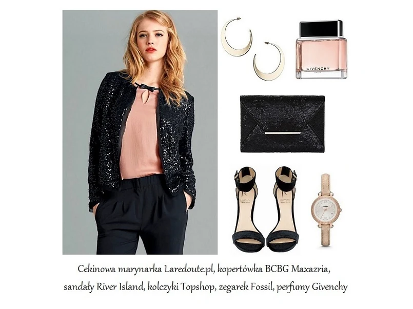 Pierwsza stylizacja to nonszalanckie połączenie delikatnej, różowej bluzki z eleganckimi spodniami oraz cekinową marynarką ze sklepu Laredoute.pl (główne zdjęcie). Zestaw ten genialnie dopełnią aksamitne sandałki, błyszcząca kopertówka oraz dodatki w postaci przykuwających wzrok kolczyków oraz zegarka, dzięki któremu nie spóźnimy się na sylwestrową zabawę. Oto kobieca interpretacja męskiego szyku!