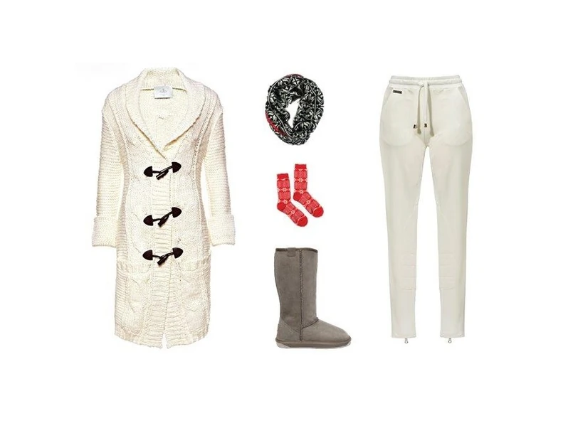 Z myślą o nienagannym stylu dla miłośniczek stoku, białe spodnie wraz z dzierganym gorsetem i błyszczącymi detalami to pomysł na super elegancki strój, bez którego ani rusz podczas świątecznego urlopu.