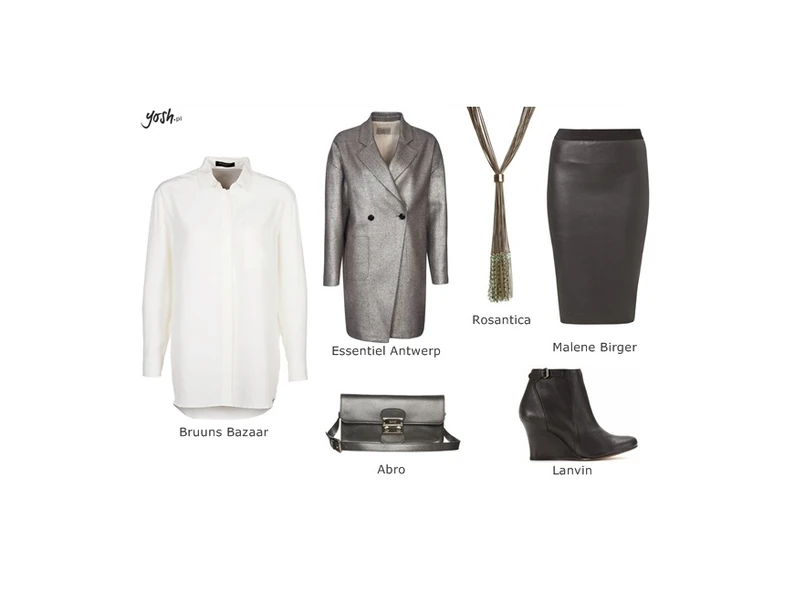 Do biura, jak i na wszelkie eleganckie wyjścia (w tym także biznesowe spotkania) polecamy klasyczną elegancję (główne zdjęcie). Koszula Bruuns Bazaar została zestawiona z ołówkową, wymsuklającą figurę spódniczką od Malene Biger. Aby obie części tworzyły całość, polecamy wpuszczenie koszuli do środka spódnicy. Taką bazę uzupełniamy przykuwającym wzrok naszyjnikiem Rosantica, a do ręki zabieramy torebkę Abro, w modnym stalowym kolorze. Będzie ona subtelnie współgrać z płaszczem Essentiel Antwerp. Do tego czarne buciki na koturnie od Lanvin i można ruszać na podbój świata!