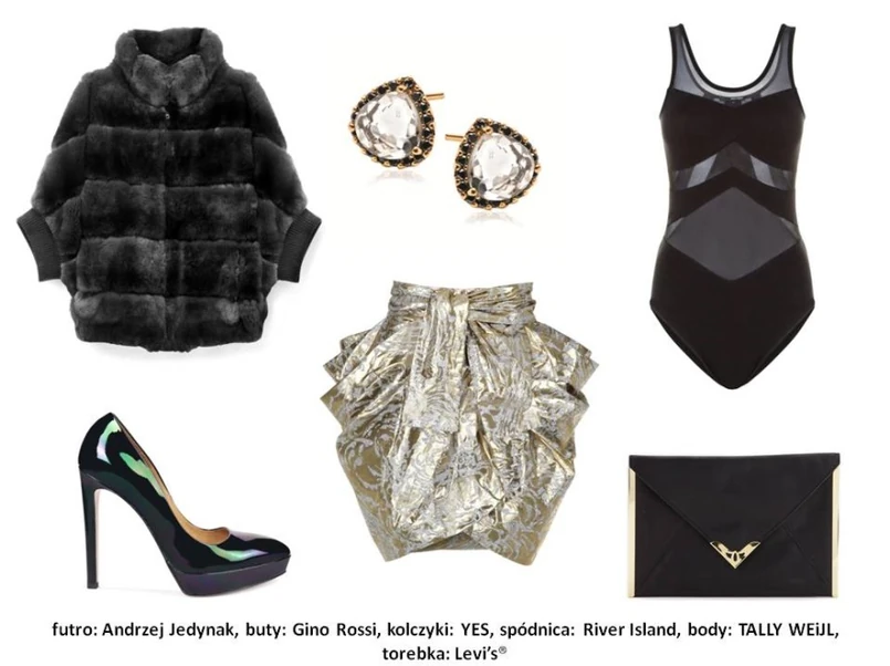 Modernistyczny glamour (główne zdjęcie). Zamiast małej czarnej idealnym sylwestrowym połączeniem będzie body i złoto-srebrna spódnica o nowatorskim kroju, uszyta z błyszczącego materiału przypominającego ozdobny papier. Jej nieregularna forma i bogate zdobienia warto zrównoważyć prostymi akcesoriami i minimalną ilością biżuterii. Kropką nad "i" w ponadczasowym stylu będzie cieniowane futro o prostym kroju. Tak skomponowany zestaw na pewno podbije klubową imprezę w artystycznym klimacie.