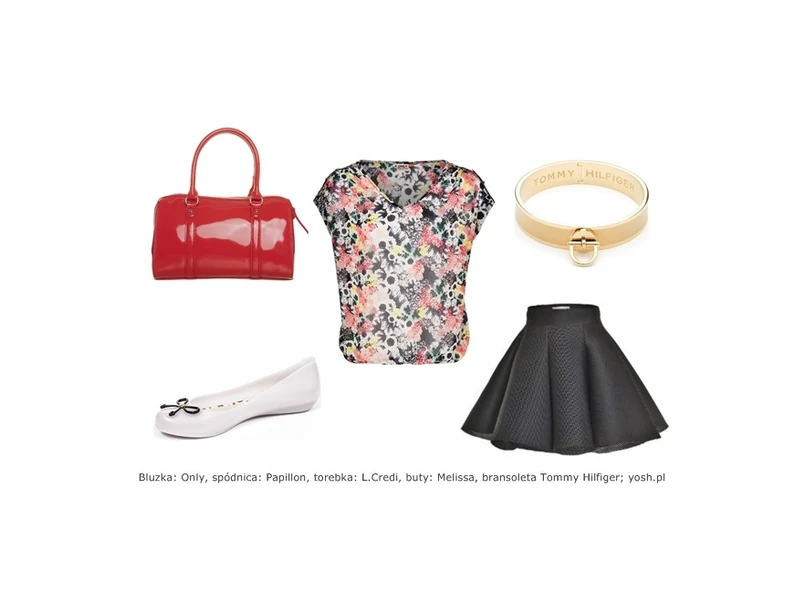 Na wiosenny sezon marka Only zaproponowała kwiecistą bluzkę, która dzięki swojemu oversize’owemu fasonowi fantastycznie ukryje wszystko to, co zamierzasz zrzucić do lata (główne zdjęcie). Rozkloszowana spódniczka od Papillon podkreśli kobiecy aspekt tego outfitu i pięknie zaakcentuje talię, a wygodne baleriny Melissa z najnowszej kolekcji, pozwolą Ci modnie i wygodnie przemieszczać się po skąpanym w słońcu mieście. Uzupełnieniem stylizacji będzie torba w czerwonym kolorze i złota bransoletka.