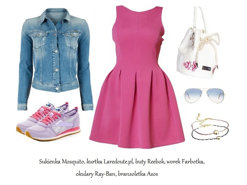 Pierwsza nasza propozycja spodoba się wielbicielkom sportowego szyku (główne zdjęcie). Różowa sukienka z zakładkami marki Mosquito nabierze sportowego charakteru, jeśli zestawisz ją z jeansową kurtką oraz tak modnymi w tym sezonie sportowymi butami. Uroczy, skórzany worek zdobiony subtelnym różowym haftem pomieści wszystkie kobiece drobiazgi, a delikatne bransoletki i okulary w stylu aviator genialnie dopełnią całości.