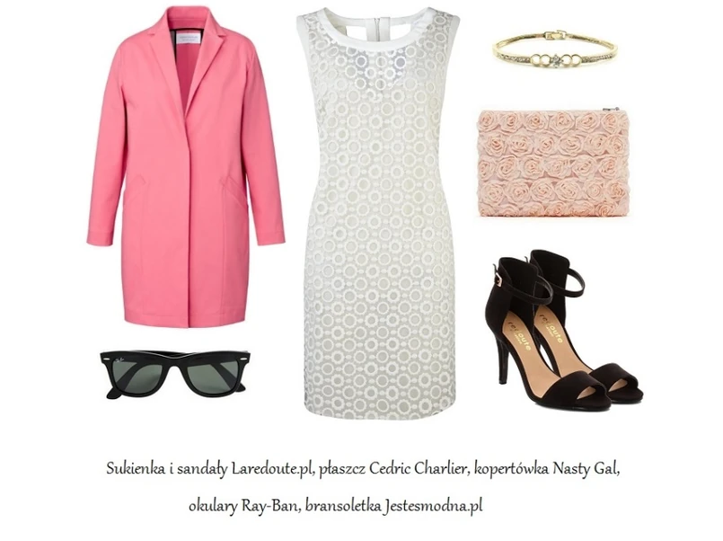 Sukienka w kolorze kości słoniowej (główne zdjęcie) – ozdobiona subtelnym haftem na delikatnej organzie – w połączeniu z różowym płaszczem, czarnym dodatkami, a także przykuwającą wzrok kopertówką w róże, stworzy elegancki look w stylu retro, który świetnie sprawdzi się podczas rodzinnych uroczystości – chrztów, zbliżających się wielkimi krokami komunii czy ślubów.