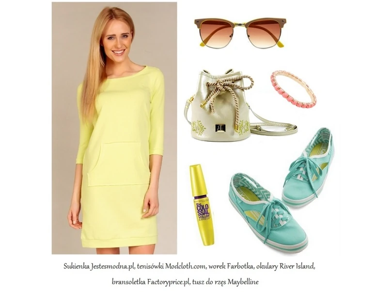 Modnie i wygodnie! Limonkowa sukienka wykonana ze 100% bawełny spodoba się miłośniczkom sportowego stylu (główne zdjęcie). Wybierając ją, postaw na minimalizm. Nie przesadzaj z dodatkami. Okulary i bransoletka w zupełności wystarczą. Skórzany woreczek ozdobiony subtelnym wzorem pomieści niezbędne rzeczy, idealnie wpisując się w klimat tej stylizacji, a tenisówki z wycięciami dopełnią całości.