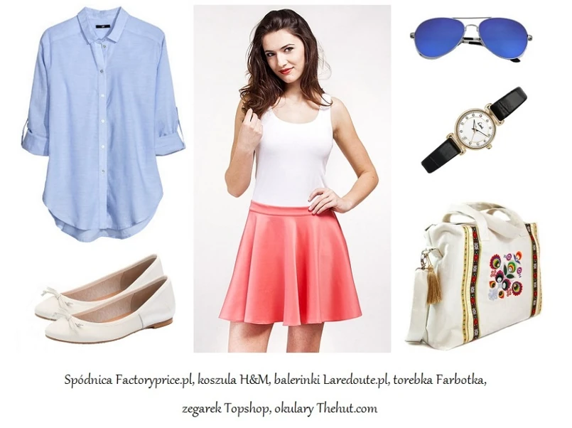 Pierwszy look to połączenie koralowej spódniczki ze sklepu Factoryprice.pl z niebieską, bawełnianą koszulą oraz jasnymi balerinkami (główne zdjęcie). Zestaw ten uzupełniają lniana torba ozdobiona folkowym haftem, klasyczny zegarek oraz modne w tym sezonie lustrzane aviatorki. Oto prosta i wygodna propozycja na co dzień!