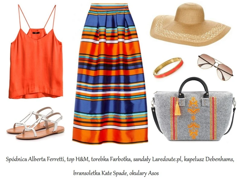 Soczyste barwy jak pomarańcz to jeden z najgorętszych trendów tego sezonu (główne zdjęcie)! Właśnie dlatego nie mogło zabraknąć go wśród naszych propozycji. Pomarańczowy top stworzy zgrany duet z ozdobioną paskami spódnicą. Filcowa torba marki Farbotka z pomarańczowym haftem doskonale się z nimi skomponuje. Świetnym dopełnieniem tego iście wakacyjnego zestawu będą białe sandały, kapelusz z szerokim rondem oraz okulary przeciwsłoneczne typu aviator.