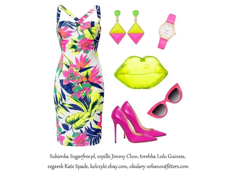 Dla wielbicielek mocnych kolorów proponujemy świetnie skrojoną, dopasowaną i podkreślająca atuty sylwetki sukienkę, która swoim wzorem przywodzi na myśl rajski ogród (główne zdjęcie). Taka sukienka w połączeniu z neonowymi dodatkami przypadnie do gustu kobietom z mocnym charakterem, które lubią wyróżniać się z tłumu.
