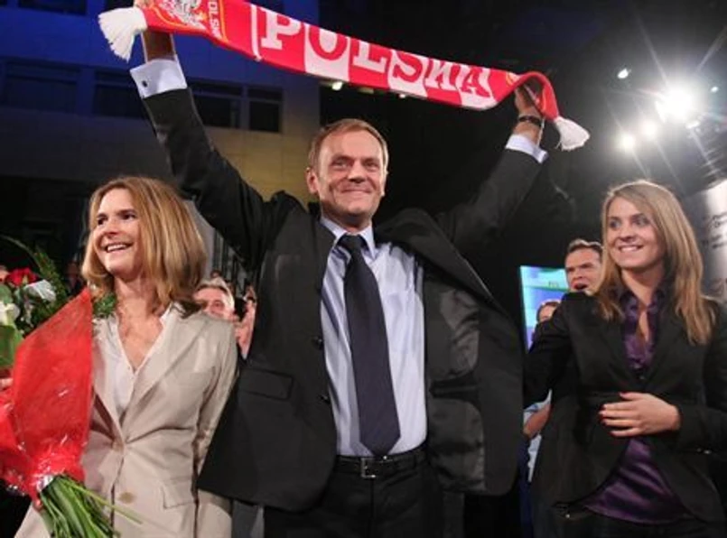 Donald Tusk, lider zwycięskiej partii, otoczył się kobietami. Kiedy przed godziną 23. podano pierwsze sondażowe wyniki wyborów, przy jego boku stały żona Małgorzata, córka Katarzyna, znana z programu "Taniec z Gwiazdami", i prezydent Warszawy - Hanna Gronkiewicz-Waltz. Wszystkie wystrojone. Żona skromna, w jasnej marynarce i z bladym uśmiechem. Córka w fioletowej, błyszczącej sukience i czarnej marynarce. Zdecydowanie zdominowała je jednak czerwień garsonki Gronkiewicz-Waltz.