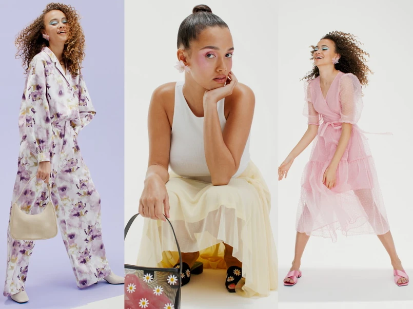 Bufiaste rękawy i wielowarstwowe spódnice otulające sylwetkę romantycznym, delikatnym tiulem i satyną - to kwintesencja propozycji Monki. Najważniejsze jej elementy to komplet składający się z satynowej bluzki i spodni oraz sukienka midi z organzy w kropki. Wyróżniające się biało-lawendowe kwiatowe printy uzupełniają delikatne neutralne tony beżu i bieli oraz pastelowy róż, fiolet i zieleń. Po prostu: wiosna, jak się patrzy!