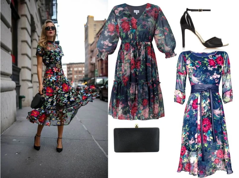 Kwiaty i grochy zawsze są na topie, dodają uroku i wdzięku. NA ZDJĘCIU: sukienka-Cosel/cosel.moda, skórzana marynarka - Fratelli/fratelli.com.pl, buty i torebka - Menbur/menbur.pl