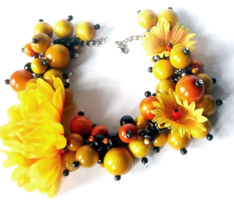Cudowną, optymistyczną propozycję ma projektantka Fiona, której prace możemy odnaleźć na DecoBazar. Nam niezwykle podoba się żółty, polny naszyjnik wykonany z przepięknych akrylowych drewnianych korali z połyskiem oraz satynowych kwiatów śred. 5 i 3 cm. Koszt tego cuda to 98 zł plus przesyłka. W galerii tej projektantki znajdziecie także inne kwiatowo-owocowe różności, na widok których pocieknie wam ślinka.