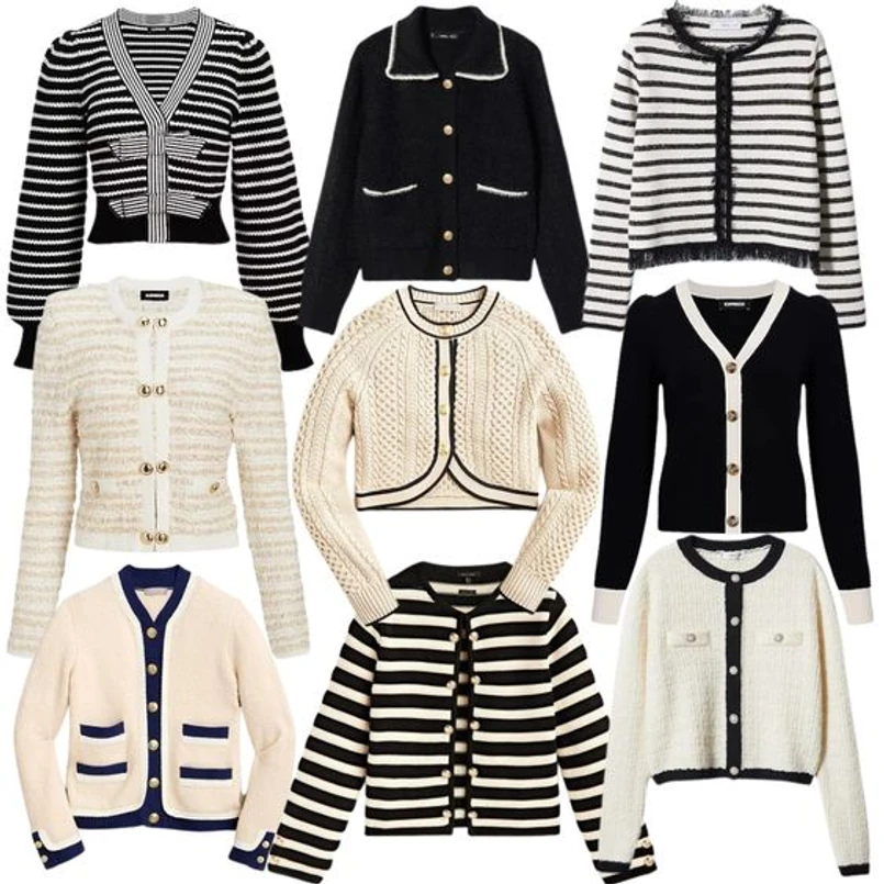 Wśród kardiganów na jesień 2023 króluje dyskretna elegancja. Na topie są modele z paskami marine, jasne tweedy, sweterki w stylu chanel z kontrastową lamówką czy pepitka. Sprawdzą się zarówno oversizowe, jak i dopasowane fasony. Długości przed, w okolicy lub lekko za talię. W kardiganach na jesień 2023 talia jest wyraźnie podkreślona, dzięki czemu sylwetka jest podzielona na 3 i zyskuje na lekkości.