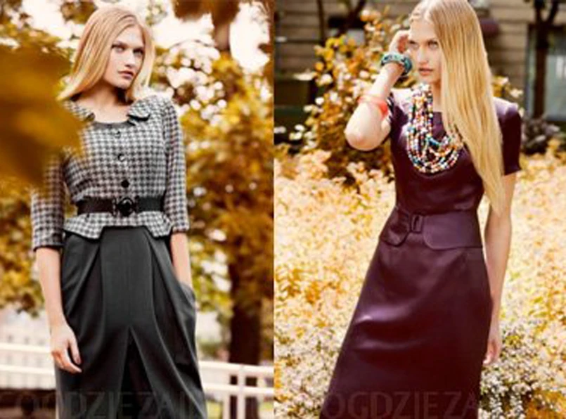 Jesienią nie należy poddawać się smutkom - zdaje się mówić kolekcja. Składają się na nią bardzo kobiece, klasyczne w kroju sukienki. Większość sięga kolan, nieliczne modele są nieco krótsze - jednak wszystko w granicach dobrego smaku. Stonowane kolory czynią ją uniwersalną, a czarno-biała, bardzo modna w tym sezonie pepitka, akcentuje aktualność.