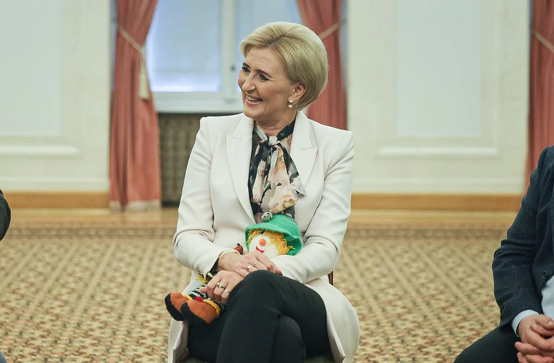 Prezydentowa w makijażu postawiła na minimalizm. Odrobina podkładu oraz pudru, tusz do rzęs oraz pomadka w jasnoróżowym kolorze to wszystkie kosmetyki, których użyła tego dnia.