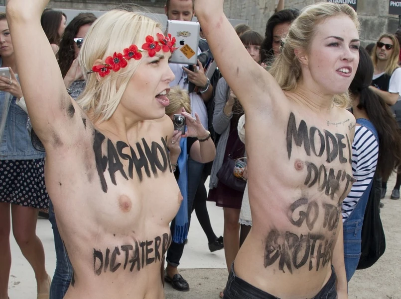 4 Na piersiach miały wypisane hasła "Fashion Dictaterror" oraz "Modelki, nie chodźcie do burdeli". Dziewczyny zatrzymały nawet przechodzącą właśnie po wybiegu modelkę Hollie-May Saker. Oburzona ich zachowaniem, krótko po występie opublikowała na Twitterze ostro brzmiący post: "Powodzenia w szorowywaniu tego gówna z twojego ciała, głupia dziwko! Nigdy nie byłam w burdelu"