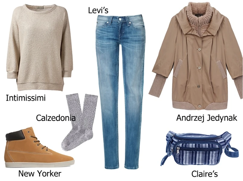 Podczas jesiennych wycieczek sprawdzą się płaskie buty za kostkę i dzianinowe skarpetki. Zapięta na biodrach nerka nie będzie krępowała ruchów, a luźna bluza i kurtka wykończona futerkiem zadbają o Twoje ciepło. Stylizacja uzupełniona niebieskimi jeansami sprawi, że ten klasyczny look pozwoli Ci rozkoszować się spacerem w dobrym stylu.