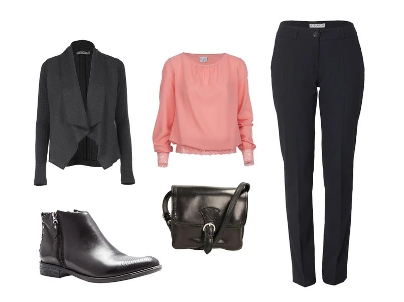 1 Uwielbiasz spódnice? Wełniana, rozkloszowana, w kolorze szary melanż i ze skórzaną lamówką sprawdzi się w połączeniu ze śmietankową bluzką z ozdobnie wykończonymi mankietami i żakietem z luźno opadającym przodem. Takie połączenie jest bezpieczne dla wielu typów sylwetek. Na zewnątrz dopełni je klasyczny, prosty, wełniany płaszcz na stójce, w grafitową kratę oraz czarne wiązane botki w rockowym stylu, z kryształkami Swarovskiego na nosku.