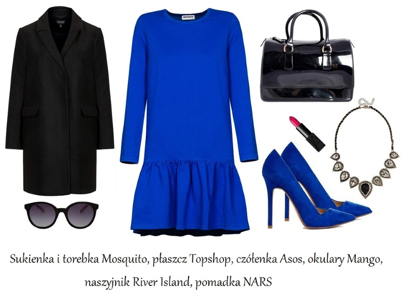 2 Na co dzień proponujemy łączyć kobalt z szarościami oraz czernią. Długi, szary płaszcz oraz czarny komin będą jak znalazł na jesień! Do bawełnianej sukienki proponujemy dobrać wygodne obuwie. Żeby nie było zbyt mdło, ten nieco sportowy look urozmaiciłyśmy limonkową torebką oraz dodatkami w kolorze fuksji. Kolorowa ważka przypięta do czarnego komina albo płaszcza robi wrażenie!