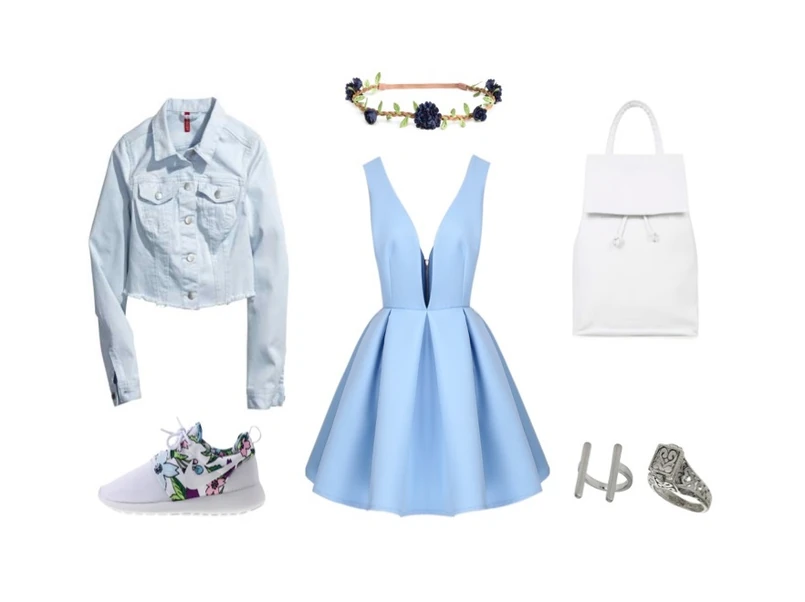 Sukienka: Romwe 119 zł, kurtka: H&M 129 zł, buty: Nike 349 zł, plecak: Top Shop 330 zł, opaska na włosy: H&M 19,90 zł, naszyjnik: H&M 14,90 zł, pierścionki: Top Shop 45 zł i 51 zł