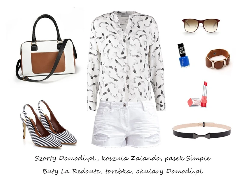1 Klasyczne jeansowe szorty, biała koszula z koronką, plastikowa torba i białe sneakersy to typowy miejski, nieco sportowy look na zakupy, spacer czy do kina. Jeśli lubicie klasykę w połączeniu z szalonymi dodatkami to ta propozycja na pewno Wam się spodoba. Typowy jeans zarówno jasny, jak i ciemny świetnie wygląda w każdym wydaniu, ale pamiętaj, że to on jest podstawą całej stylizacji. Dodatki dobieraj więc do szortów, a nie na odwrót.