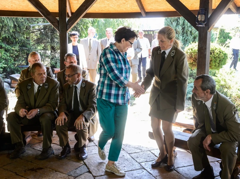 Ewa Kopacz u leśników w stylizacji "dziewczyna farmera" i w bardzo drogich trampkach