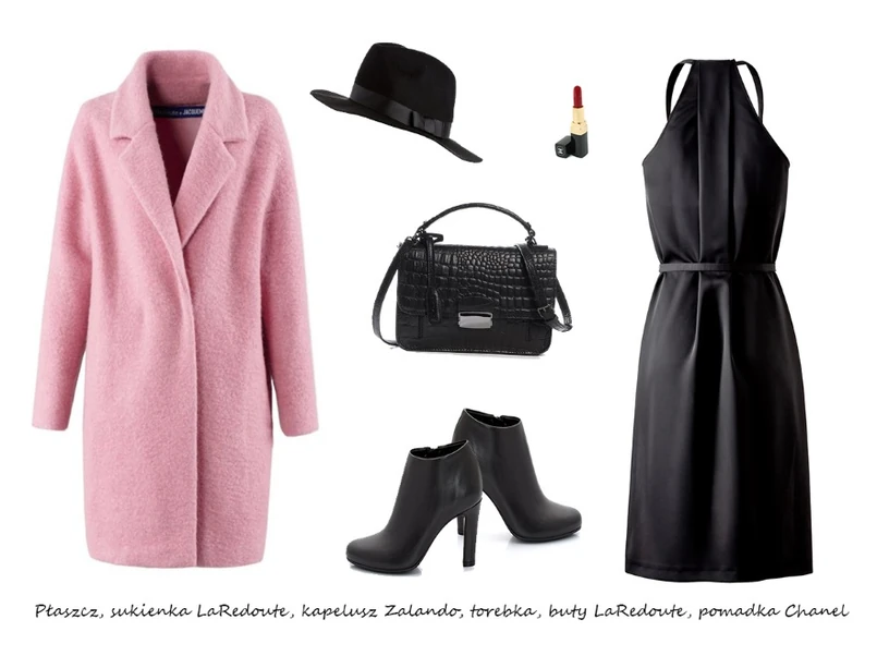 Klasyczna mała czarna w luźniejszym wydaniu w połączeniu z nonszalanckimi dodatkami i wełnianym płaszczem, w kolorze pudrowego różu, to propozycja dla Pań, które lubią elegancję w miejskim stylu.