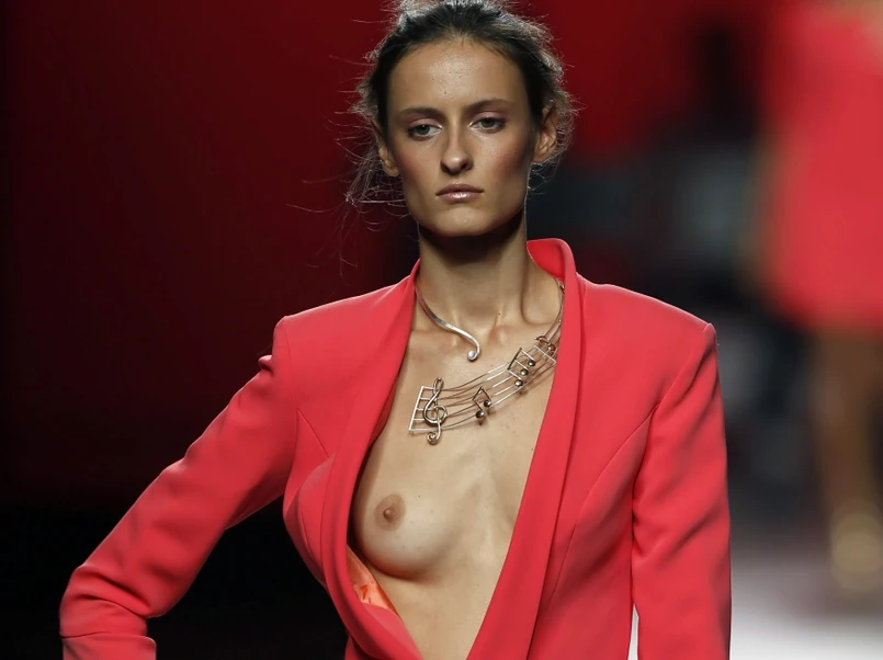Garnitur i naga pierś na wierzchu! Innowacyjna stylizacja z hiszpańskiego pokazu. FOTO