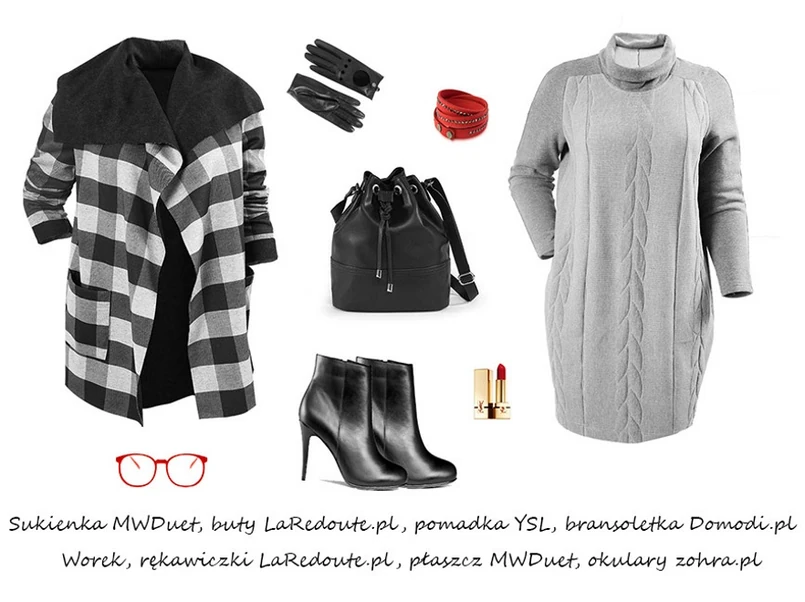 Klasyczna stylizacja urozmaicona pięknym płaszczem w dużą kratę sprawi, że całość nabierze charakteru. Pod płaszcz koniecznie wygodna, dzianinowa sukienka w kolorze szarego melanżu, z aplikacją warkocza. Prosty, ale efektowny look świetnie sprawdzi się nie tylko w pracy.