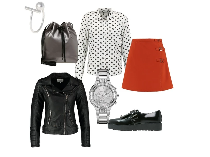 1 Ramoneska – Vero Moda 299zł, koszula – Dorothy Perkins 109zł, zegarek – GUESS 1140zł, szpilki –Kiomi 339zł, torebka – Paul’s Boutique 299zł, spódnica – Second Female 419zł.