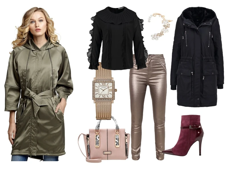 3 Parka – Dorothy Perkins 399 zł, torebka – Even and Odd 149 zł, buty – Laura Biagiotti 479 zł, bluzka – Lipsy 209 zł, spódnica – Missquided 119 zł, zegarek – Caravelle 639 zł, kolczyki – Aldo 94 zł