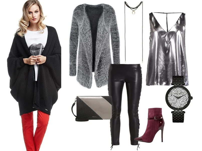2 Kardigan – Even and Odd 109 zł, torba – Kiomi 299 zł, kolczyki – sweet deluxe 99 zł, spodnie – Top Shop 209 zł, zegarek – PUMA Suede 499 zł, tunika – Bik Bok 129 zł, buty – Even and Odd 249 zł.