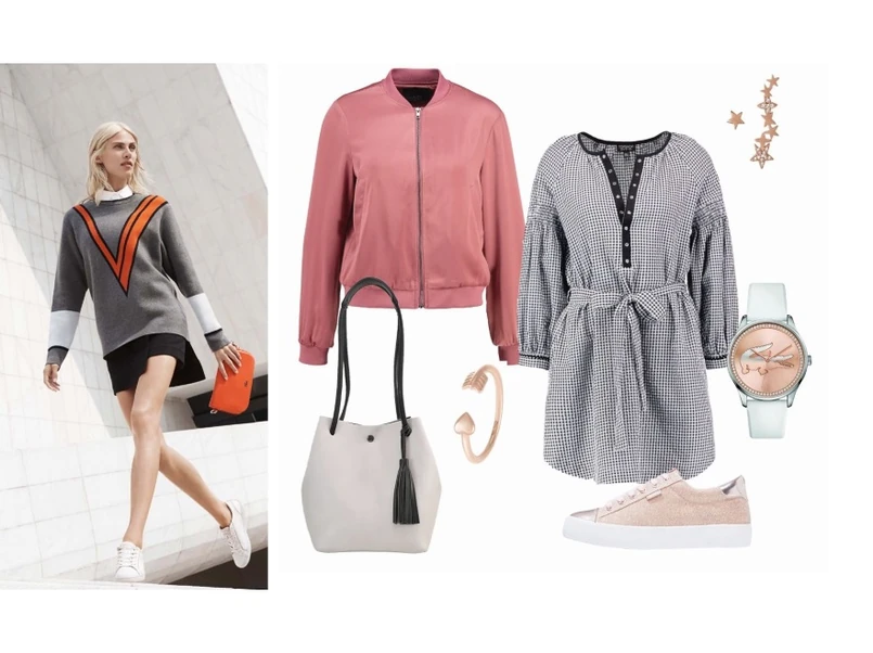 Buty – MTNG 149 zł, sukienka – Top Shop 289 zł, torebka – Even and Odd 109 zł, kurtka – Even and Odd 149 zł, kolczyki - Pilgrim 84 zł, pierścionek - Ted Baker 109 zł, zegarek – Lacoste 755 zł.