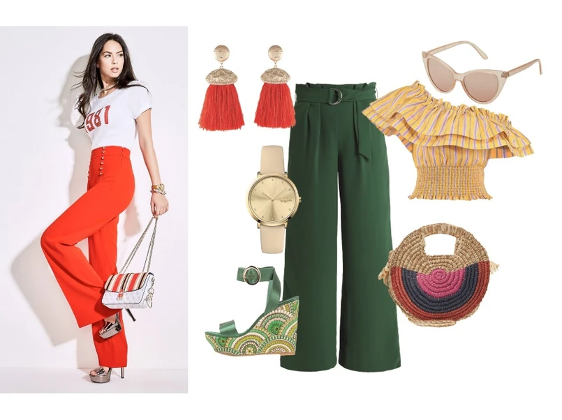 1 Spodnie – Glamorous 179 zł, klapki – Slydes 169 zł, zegarek – GUESS 399 zł, naszyjnik – Top Shop 94 zł, top – New Look 64 zł, torebka – Billabong 229 zł, okulary – Kiomi 64 zł.