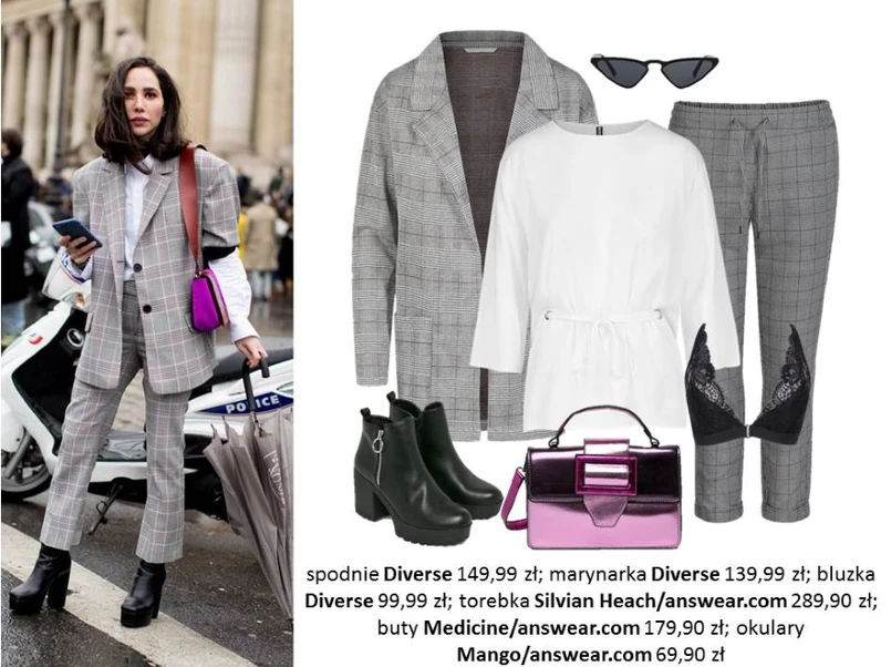 3 W tym sezonie garnitur noś w wersji total look i baw się jedynie dodatkami. Tym razem wszystko jest dozwolone. Jeśli chodzi o buty zarówno szpilki, jak i masywne sneakersy. Torebki – metaliczne listonoszki, pikowane shoppery, a nawet pastelowe kopertówki. Biżuteria – kolczyki z chwostami, pierścionki z oczkiem w kolorze garnituru, złote łańcuszki z muszelkami. Totalna dowolność.