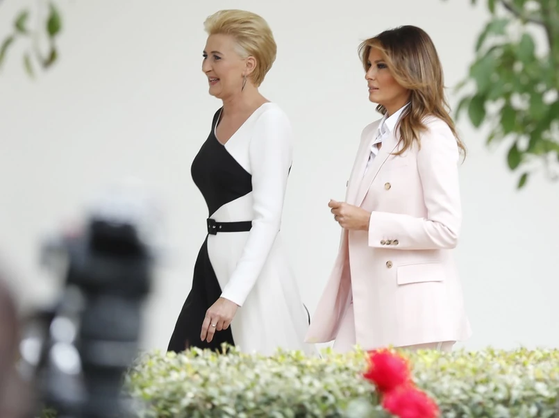1 ... Polska prezydentowa wystąpiła w sukni, którą z łatwością można by sobie wyobrazić jako strój na uroczysty bankiet. Pani Trump postawiła na coś zupełnie innego - elegancki, ale zdecydowanie bardziej "użytkowy" garnitur w kolorze jasnego różu...