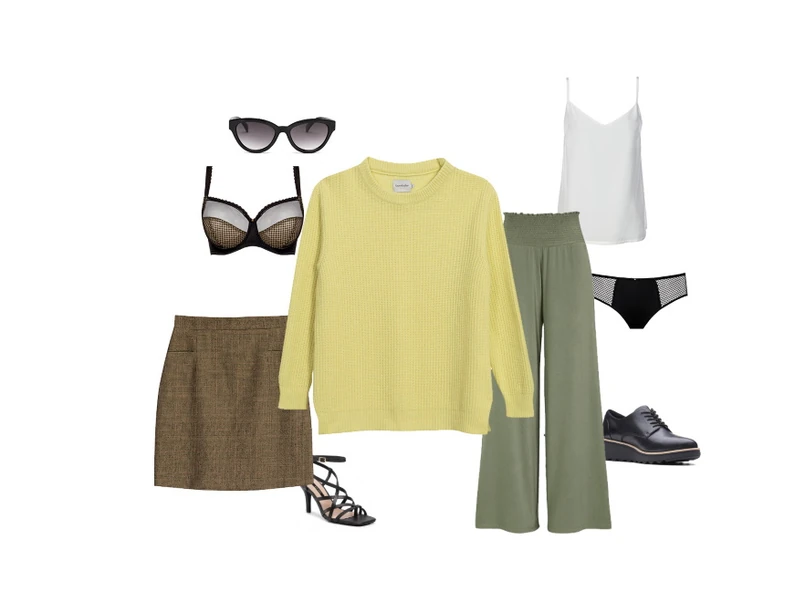 1/4 Casual Friday to dzień, w którym możesz pozwolić sobie poszaleć ze stylizacją. Cytrynowy sweter połącz ze spódniczką w drobną kratę lub spodniami z lejącego się materiału. Nie zapomnij o eleganckich butach, które po pracy możesz zmienić na białe trampki i wyglądać nadal stylowo. NA ZDJĘCIU: Cytrynowy sweter oversize: Bombshe, 379 zł; Spodnie: Cellbes, 139 zł; Jedwabny top: Patrizia Aryton, 329 zł; Spódniczka: Bombshe, 229 zł; Czółenka: Gino Rossi, 299,99 zł; Bielizna: Samanta, góra 179 zł, dół 89 zł; Półbuty na koturnie: Clarks / Cellbes.pl, 349 zł; Okulary: Soyaconcept / Cellbes.pl, 79 zł.