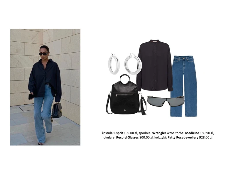 1/3 Czarna, oversize'owa koszula i jeansy z lekko rozszerzaną nogawką to doskonały look do pracy, randkę, czy na spotkanie ze znajomymi. W przypadku takiej klasycznej stylizacji możemy zaszaleć z dodatkami i urozmaicić ją kolorami, lub dodać jej elegancji dzięki srebrnej biżuterii, czarnej skórzanej torbie i modnym okularom.