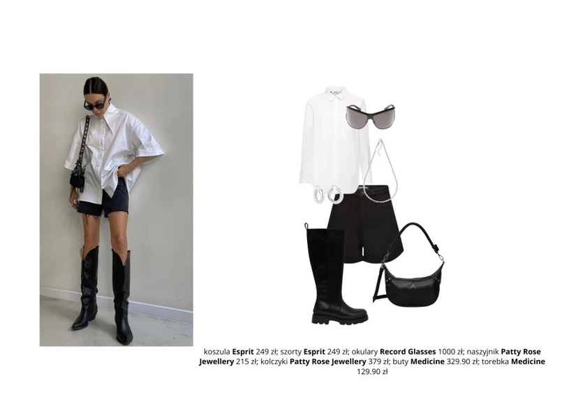 1/3 Biała koszula i czarne szorty to uniwersalne połączenie, które stanowi doskonałą bazę w stylizacji. W zależności od wizji oraz potrzeb możemy do niej dobrać praktycznie każdy dodatek. Aby nadać naszej stylizacji rockowego charakteru możemy dopełnić ją długimi kozakami, skórzaną mini torebką, srebrną biżuterią oraz dużymi czarnymi okularami, a cały look uzupełnić czerwonymi ustami oraz fryzurą typu sleek bun.