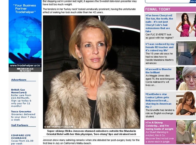 Ulrika Jonsson, prezenterka BBC szwedzkiego pochodzenia, po urodzeniu czwartego dziecka cierpiała z powodu pociążowych kilogramów i ogromnych piersi. W marcu tego roku przeszła chirurgiczną operację ich zmniejszenia i od tego czasu schudła o kilka rozmiarów.
