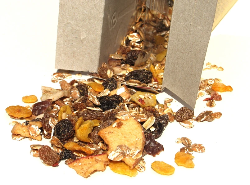 Muesli z suszonymi owocami - dostarcza sporej dawki energii, bo zawiera korzystne dla organizmu cukry (węglowodany złożone), mnóstwo witamin, wzmacniających organizm, a przede wszystkim dużo błonnika, który usuwa z organizmu zbędne produkty przemiany materii i toksyny, skutecznie go oczyszczając.