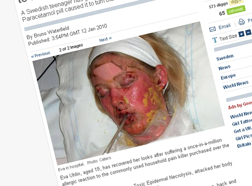 Eva Uhlin była śliczną blond nastolatką ze Szwecji. Do czasu zażycia jednej feralnej tabletki paracetamolu. Skóra jej twarzy zaczęła nabierać czarnego koloru, a na koniec odpadła. Przyczyną była rzadka reakcja alergiczna, która dopada jednego na milion konsumentów tego najpopularniejszego na świecie leku.