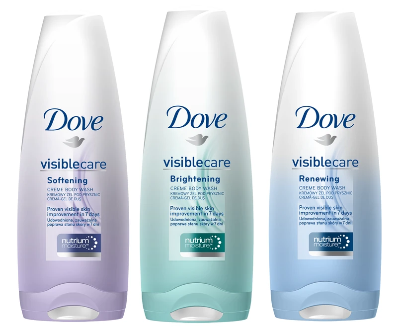 Dove VisibleCare z NutriumMoisture™ to przełomowy żel do mycia ciała, który łączy w sobie łagodne składniki myjące ze składnikami nawilżającymi, identycznymi z tymi występującymi w skórze. Dove VisibleCare z NutriumMoisture™ w klinicznie udowodniony sposób redukuje ubytki w skórze, spowodowane codziennym myciem, uzupełniając barierę ochronną tak, by skóra wyglądała zauważalnie piękniej po zaledwie 7 dniach.