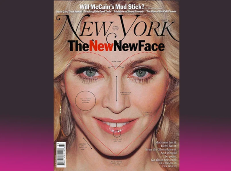 Jak stwierdza magazyn "New York”, to zasługa nowego ideału piękna, który najlepiej uosabia obecna twarz Madonny. Gładkie, ale nie nieruchome czoło, duże oczy i wystające kości policzkowe, usta pełne, ale nie nienaturalnie spuchnięte, prosty i wcale niemały nos, lekka szczęka z delikatnie zarysowanym podbródkiem. To dzięki owalowi twarzy w kształcie serca Madonna wciąż wygląda młodzieńczo. I choć zdarzają się jej wpadki, gdy wychodząc z centrum kabały w Nowym Jorku, pokazała się bez make-upu, to w odpowiednim świetle i z makijażem wciąż wygląda na 30-latkę.